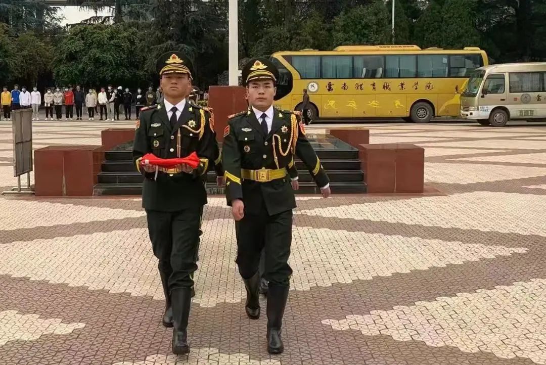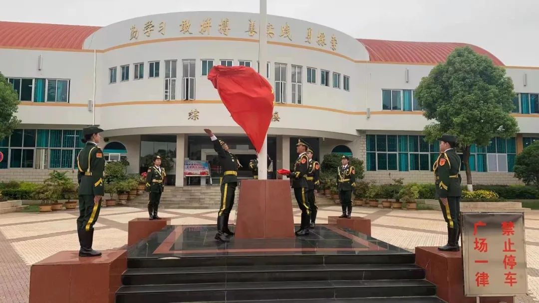 在主持人宣布升旗仪式开始后,国旗护卫队踏着整齐的步伐,护送着鲜红的国旗走向升旗台,伴随着庄严的国歌,五星红旗冉冉升起。