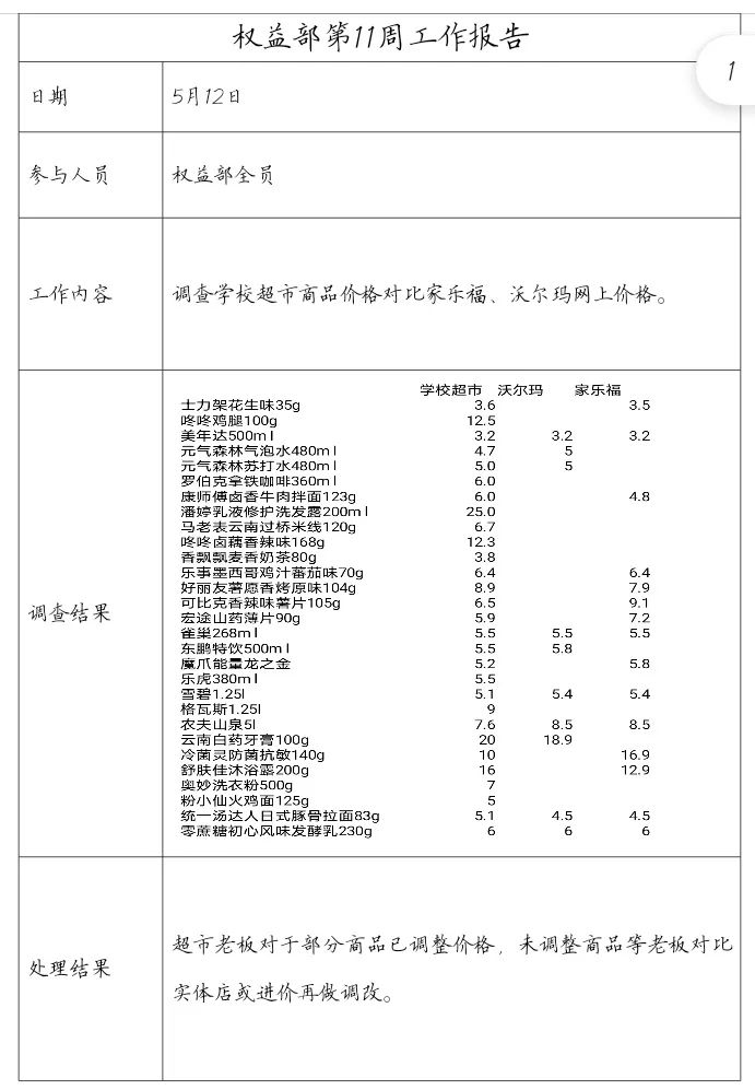 在五一期间对家乐福以及沃尔玛超市调查中,权益部成员对于同学们反映的超市物品进行了明确的价格对比,经过此次调研活动,除少数商品外,校园超市价格大部分持平。具体调研情况如下: