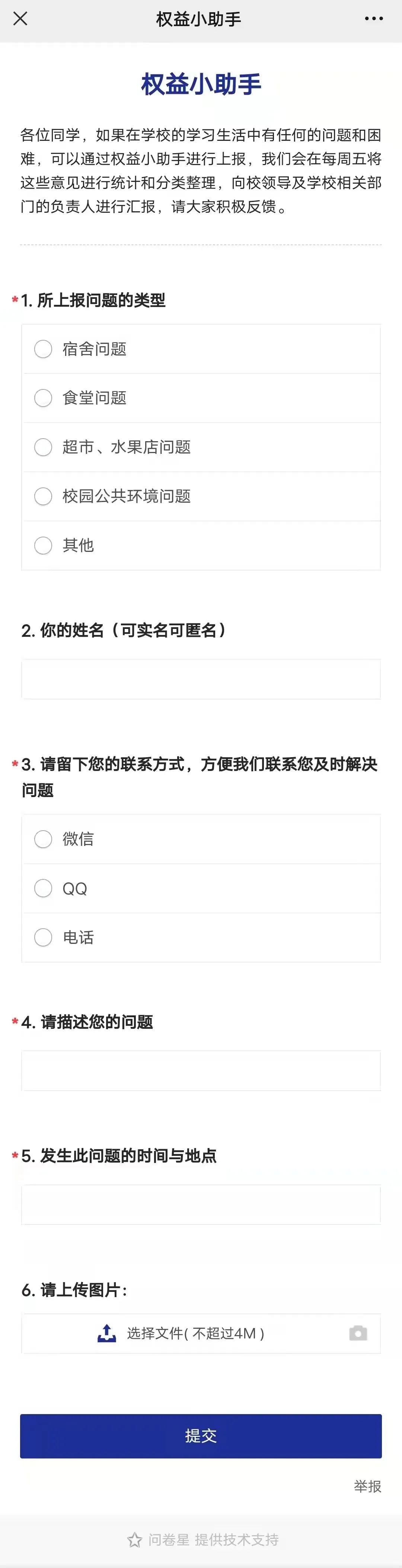 同学们,有意见,大胆提,我们将会认真听取你们的建议、意见,聚焦与同学密切相关的普遍性诉求,以更好地服务同学发展、助力学校建设。