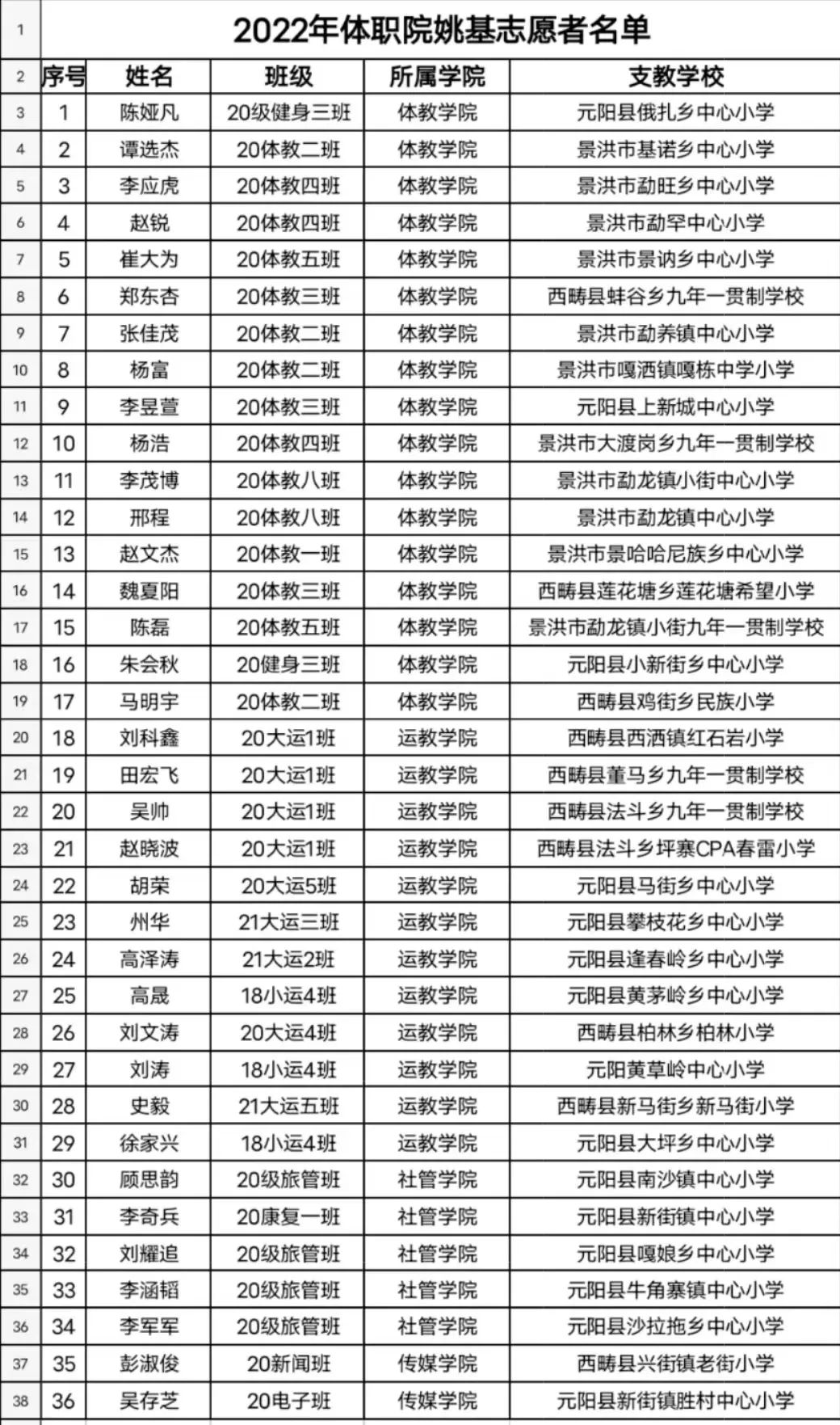 本次姚基金选拔,最终挑选出了体教学院17名、运教学院12名、社管学院5名、传媒学院2名,共36名同学。已确定前往景洪、元阳、西畴三个县的36所学校支教。具体名单如下: