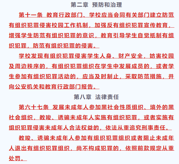 为防止黑恶势力侵害未成年人,反有组织犯罪法完善学校的防范职责和报告义务,增加有关部门对未成年人开展反有组织犯罪宣传教育的规定,规定对涉及未成年人的有组织犯罪活动依法从重追究刑事责任等。