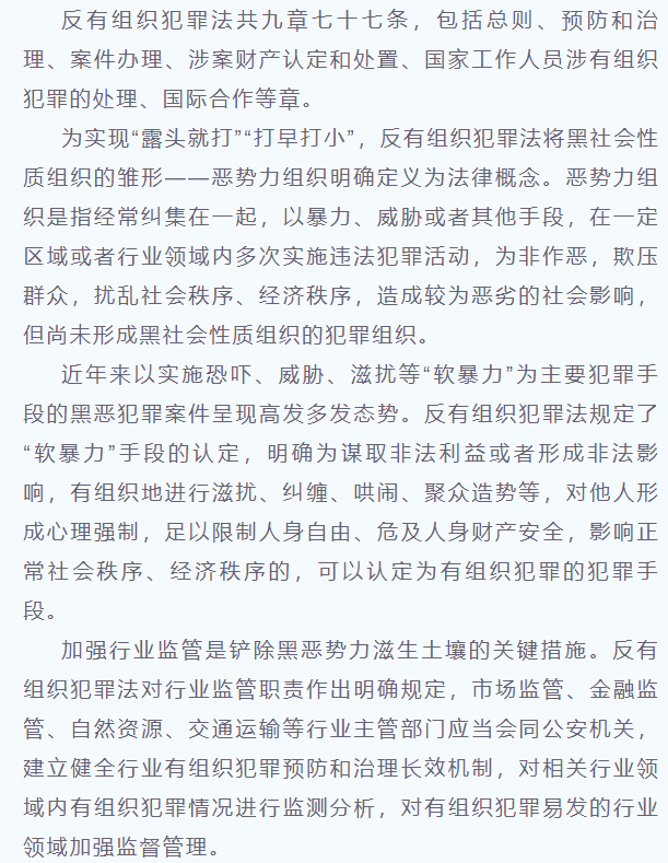 该法自2022年5月1日起施行,共9章77条,包括总则、预防和治理、案件办理、涉案财产认定和处置、国家工作人员涉有组织犯罪的处理、国际合作等,对于建设更高水平的平安中国、法治中国,不断增强人民群众的获得感、幸福感、安全感,确保人民安居乐业、社会安定有序、国家长治久安,具有重大意义。反有组织犯罪法明确了有组织犯罪、恶势力组织的概念,对恶势力组织可以适用法律规定的惩治和防范措施,并明确了利用网络实施有组织犯罪、“软暴力”行为的定性。