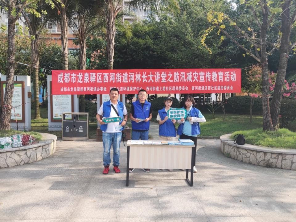 在成都市龙泉驿区西河街道滨西社区绿洲广场上,河小青、民间河长切实履行好“宣传员”职责,深入街道社区开展河长制进社区(河长制大讲堂)之防汛减灾宣传教育活动。