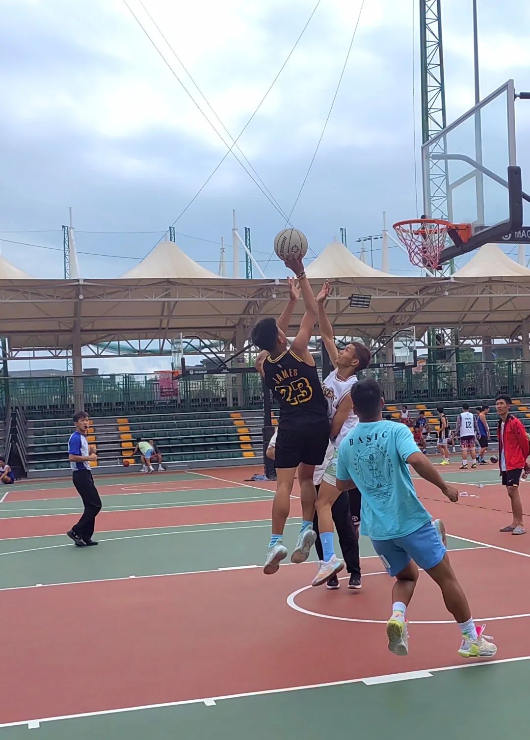 每个精彩的瞬间都记录在赛场上,有默契的传球抢断、准确的投篮入框还有热烈的加油喝彩,每一记漂亮的进球总是伴随欢呼和掌声。队员们全力以赴积极进攻,顽强防守,队员之间的互相配合和绝妙的球技,将比赛推向了高潮,赢得阵阵喝彩声。