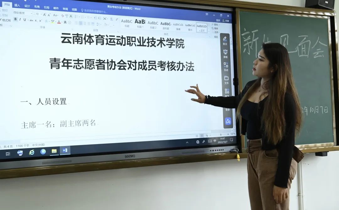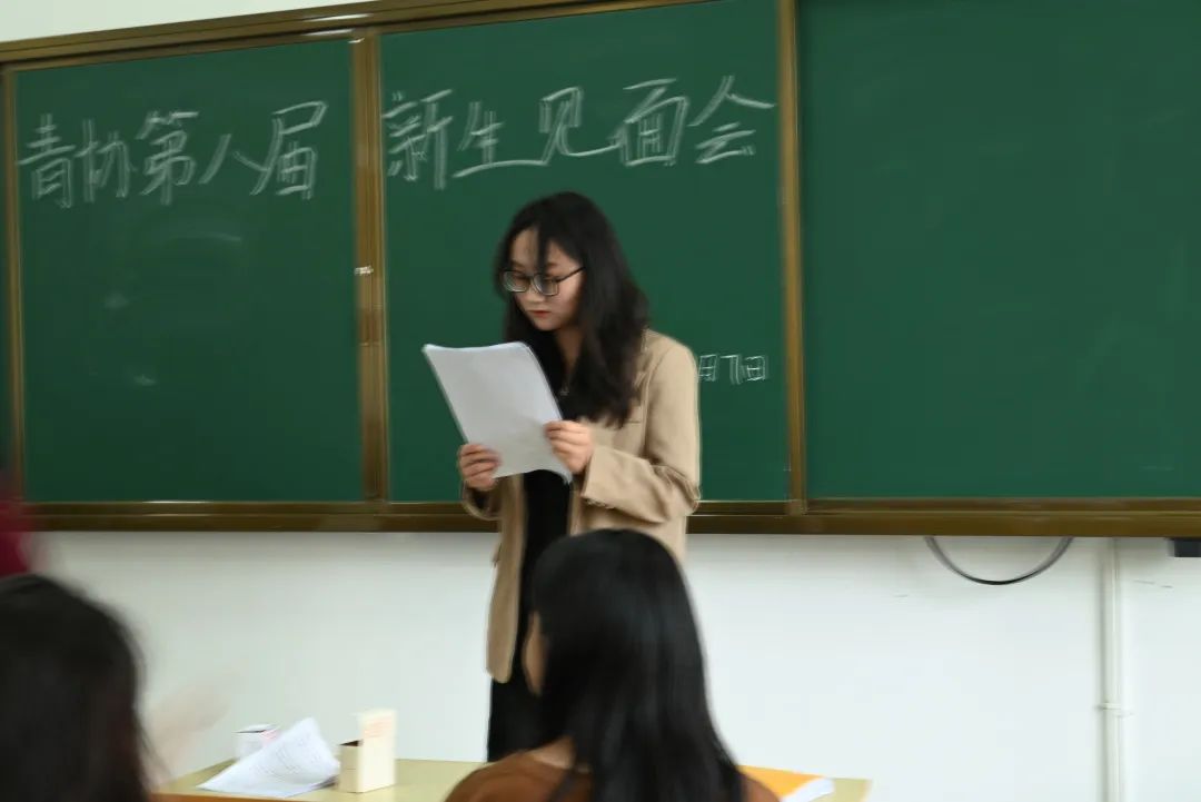 会议第四项议程:青协第六届优秀志愿者及宣传部部长杨泽英为大会致辞,并表示对于第八届青年志愿者协会新成员的热烈欢迎,学姐言简意赅,简单几句便让小萌新们感受到了来自青协大家庭的温暖。