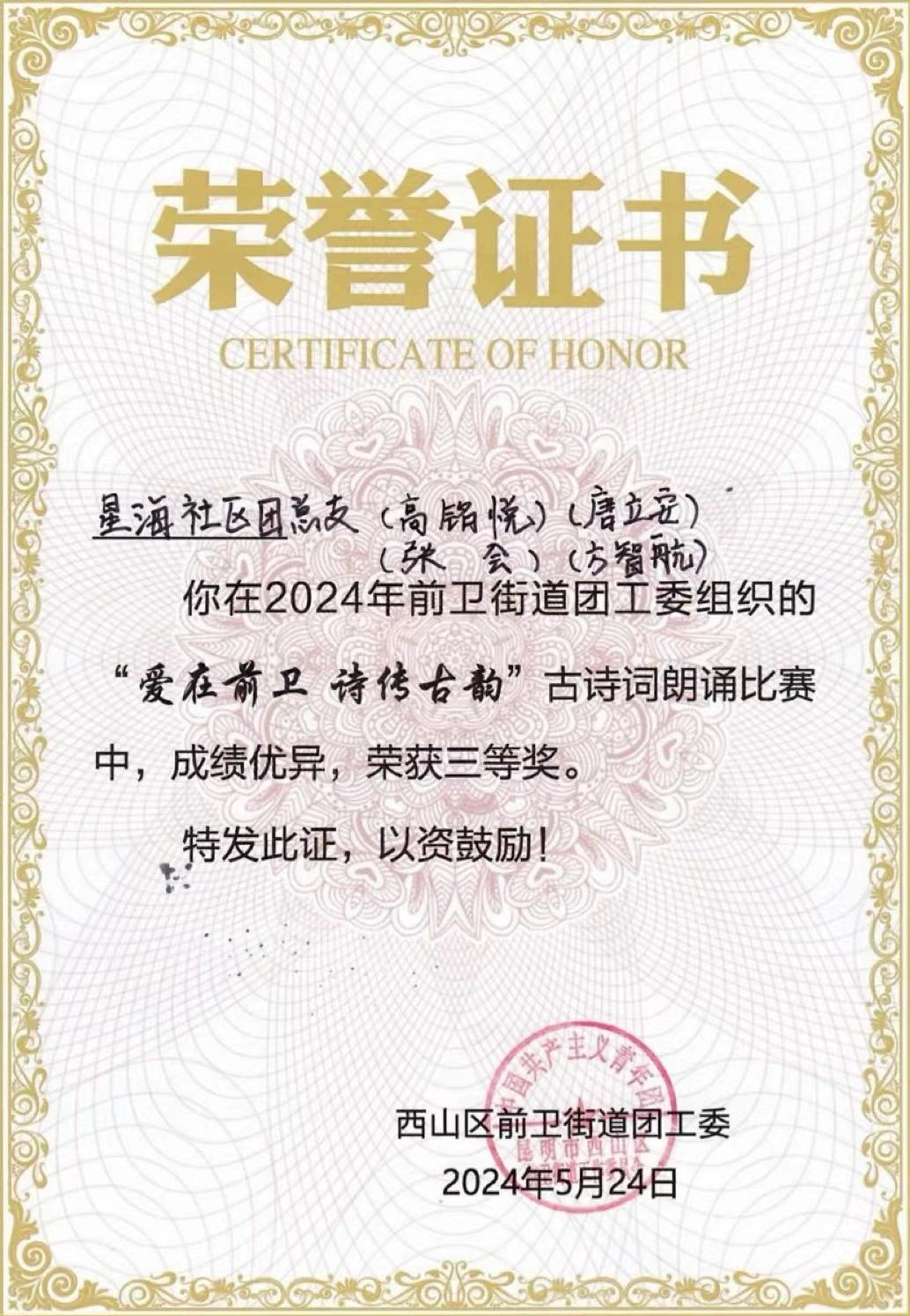 5月11日上午,云南体职院团委与前卫街道星海社区进行共建,开展团支部结对、团员报到,万象城官网师生代表赴昆明市西山区前卫社区开展“行走的张桂梅思政大讲堂”进社区活动,充实城乡社区基层团组织工作力量。在参赛的19支队伍中,万象城官网团员青年张会、高铭悦、唐立安、方智航四位同学荣获本次朗诵比赛三等奖。
