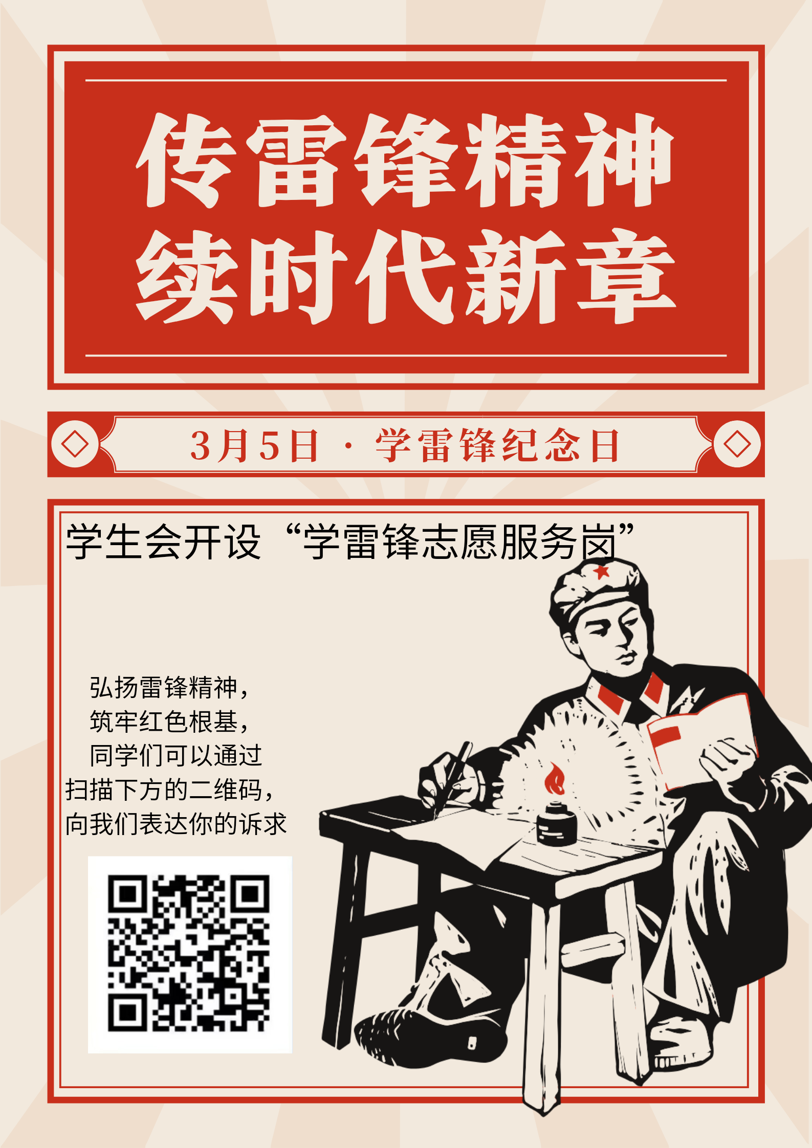 习近平总书记指出:“雷锋精神,人人可学;奉献爱心,处处可为。”作为新时代的新青年,我们应以雷锋为榜样,将个人的理想追求融入国家和民族的伟大事业中,敢想敢为、善作善成,以助人为乐的情怀,在服务人民的实践中让雷锋精神绽放更加璀璨的光芒!