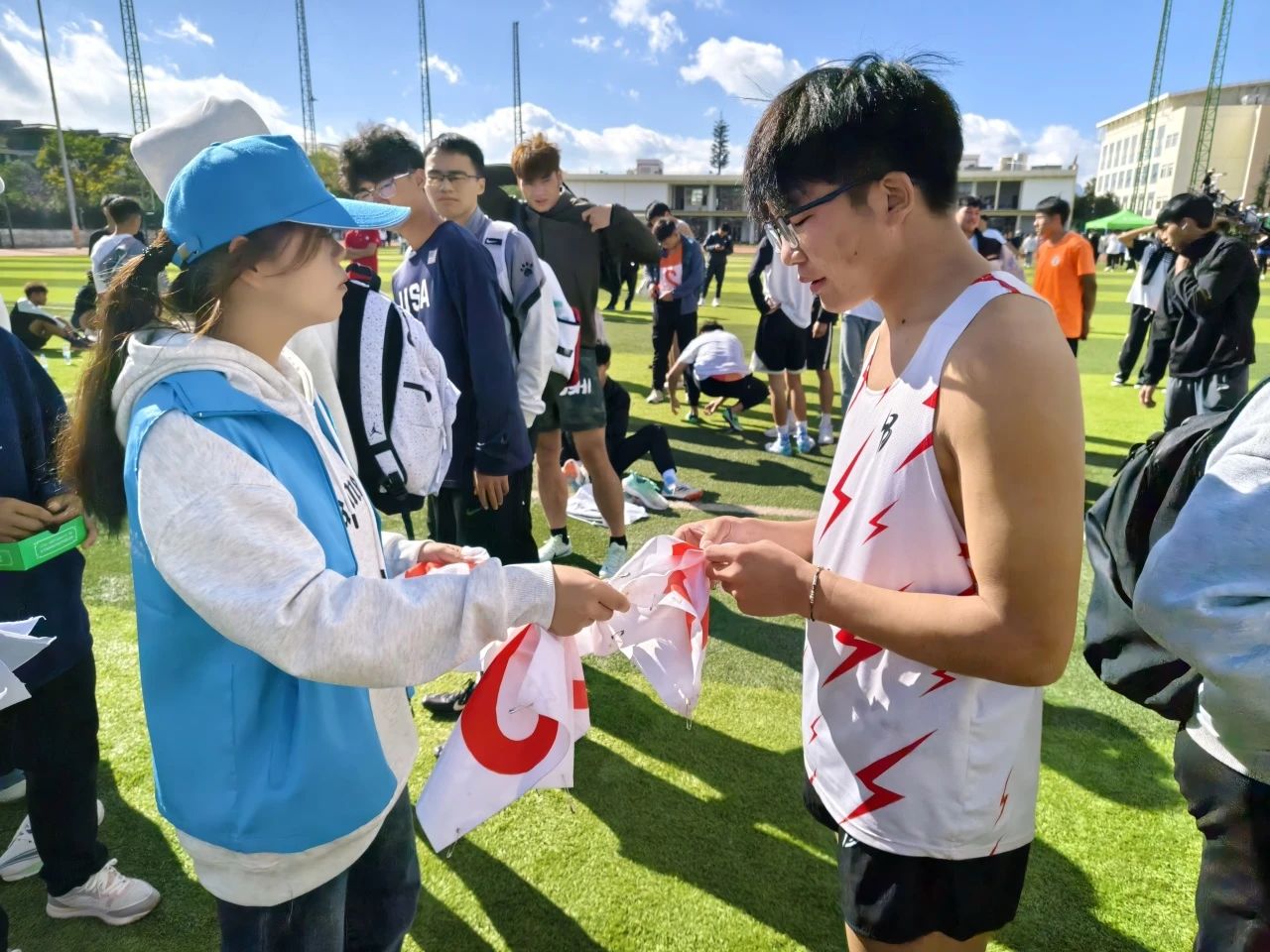 检录组的志愿者们仔细核对运动员的信息,确保每位选手都能按时准确地进入比赛场地,并为运动员送上标签号码。当没有运动员来时,他们便在背后默默地整理号码牌。