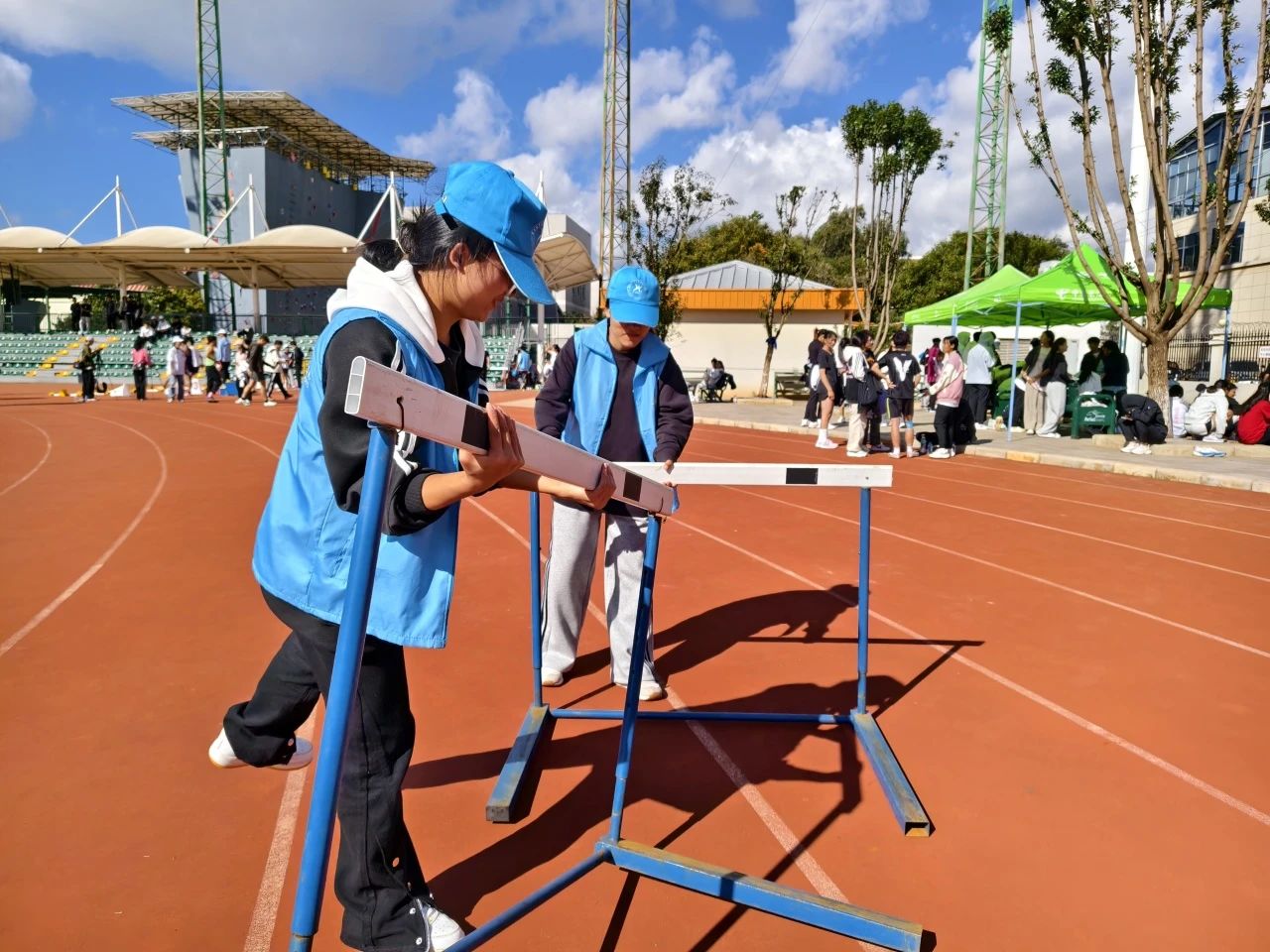 维持秩序组的志愿者们穿梭在人群和赛场之间,时刻提醒观众文明观赛,保持赛场通道畅通,保障了运动会期间的安全与良好秩序。