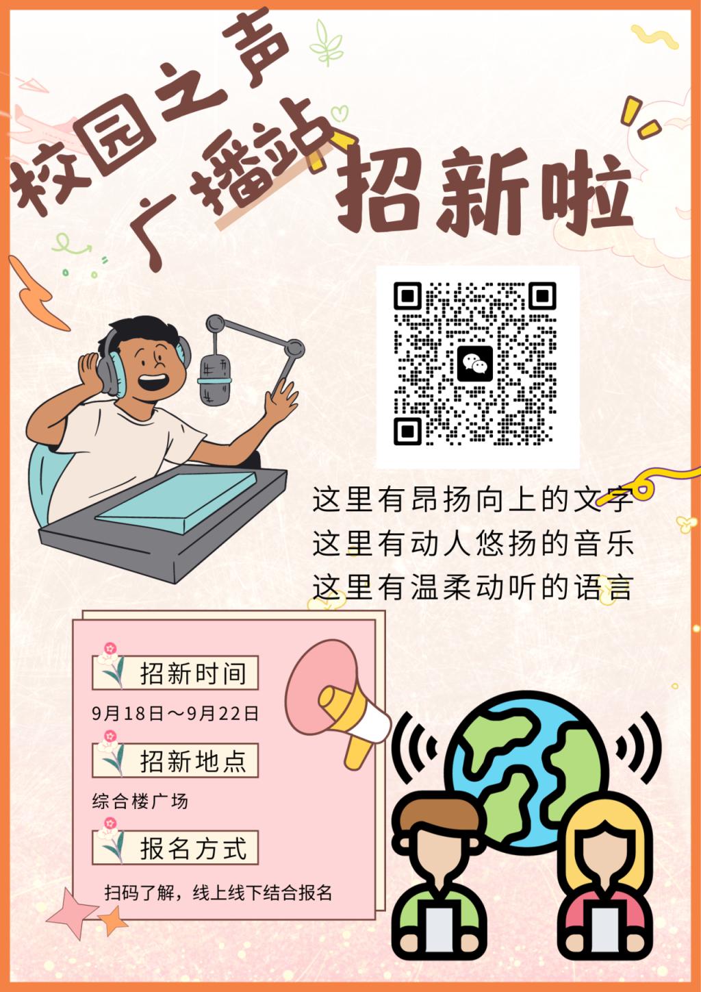 本次招新将以线上线下结合的形式进行,可以扫描下方海报上的二维码按照要求填写报名表或到综合楼门前进行现场报名。