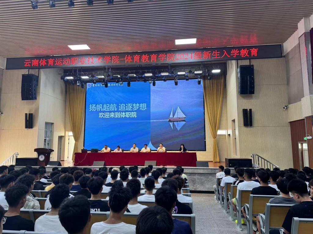 2024年8月31日上午,体育教育学院在新学期伊始之际,隆重举行了2024-2025秋季学期新生入学教育大会。本次大会以“扬帆起航 追逐梦想”为主题,旨在引导新生树立正确的价值观,增强安全意识,明确学习目标,为即将开始的大学生活打下坚实的基础。