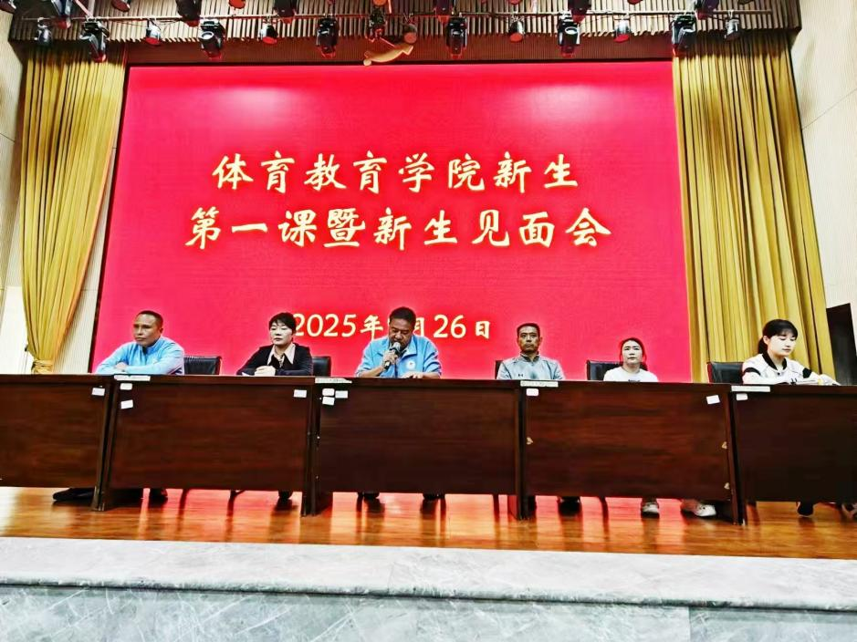 为帮助 2025 级新生快速融入大学生活、明确学业方向与成长目标,近日,体育教育学院在学院报告厅隆重举办新生开学第一课暨新生见面会。学院党总支书记王延勇、院长王井明、专职副书记李娜、副院长马璐、专职组织员潘泽凯、教学秘书陈子依出席会议,2025 级全体新生参会,会议由郭璐主持。