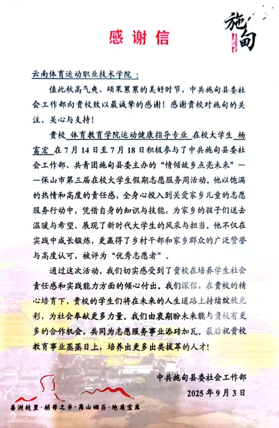 近日,我院2023级运动健康指导专业学生杨富宏,在暑期积极投身家乡公益事业,参与了由中共施甸县委社会工作部、共青团施甸县委主办的“情倾故乡·点亮未来”——保山市第三届在校大学生假期志愿服务周活动,其热情奉献与专业素养获得了主办方的高度认可,并收到了来自中共施甸县委社会工作部的感谢信。