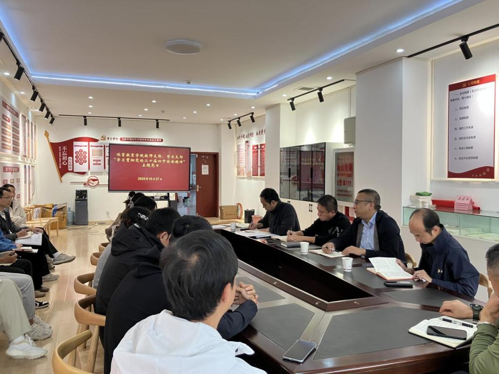 10月27日下午,体育教育学院在体操馆二楼党员活动室举行“学习贯彻党的二十届四中全会精神”主题党日。学校党委副书记张永和到会指导,学院全体教师党员和学生党员代表参加。