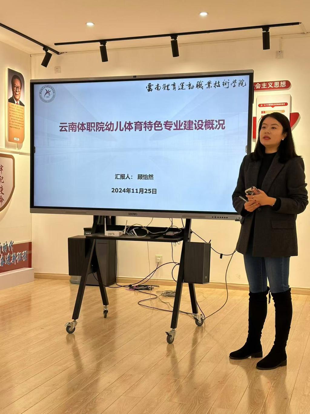 按照活动流程,顾怡然老师对我院幼儿体育教育特色专业的设立情况做了完整的汇报。首先,在全民、全社会对幼儿健康成长日益关注的背景下,我院积极响应国家号召,致力于培养具备专业知识技能、引领幼儿体育教育事业发展的复合型人才。其次,我院持续在课程设置、师资力量、教学实践、科研创新等方面进行思考探索与创新发展。