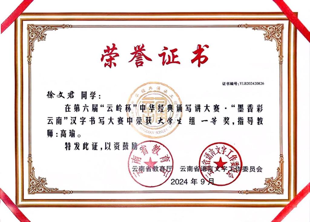 由云南省语言文字工作委员会、云南省教育厅主办的第六届“云岭杯”中华经典诵写讲大赛评选结果近日揭晓,体教学院2023级民族传统体育专业学生徐文君,凭借其书法作品《强国圆梦,功成有我》,在众多参赛者中脱颖而出,荣获了一等奖的佳绩。