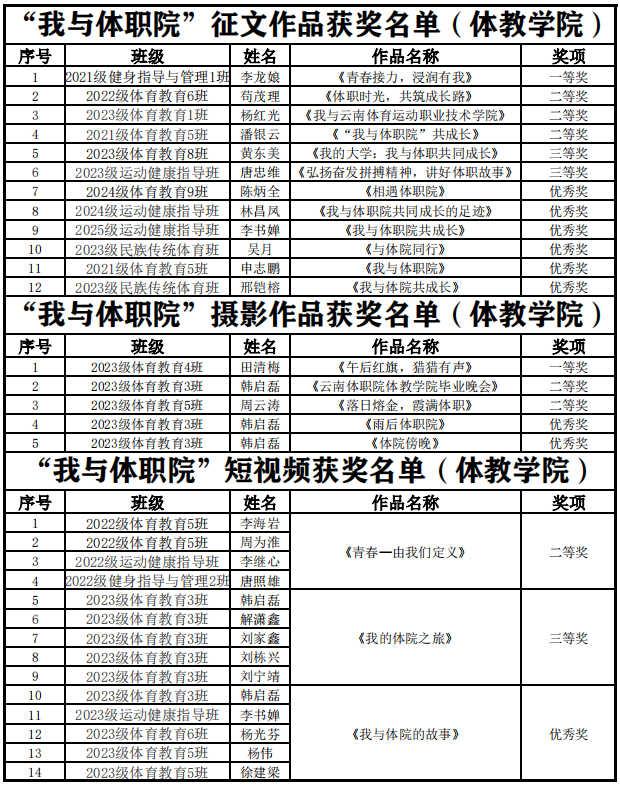 根据《allwincity万象城官方网站高质量发展论坛系列活动总体工作方案》要求,学校组织开展高质量发展论坛“我与体职院”系列学生活动,活动评选于2024年10月落下帷幕,在本次活动中体育教育学院众多学生作品获得了优异成绩,学生们通过征文、摄影、短视频等形式,分享自己与学院的共同成长故事,展现学院的发展成就和美好愿景,充分展现了体育教育学院学生们的专业素养和创新精神,他们的精彩表现不仅为学院赢得了荣誉,也为其他学生树立了榜样。