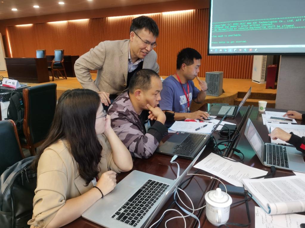 现场实操教学环节由赛尔网络技术专家史章君教授进行授课,以建设IPv6单栈校园网为背景,结合理论知识讲解,完成了校园网IPv6地址规划、静态路由配置、OSPFv3动态路由配置、EBGP和IBGP配置、DHCPv6有状态地址分配和无状态SLAAC地址分配用户接入等技术知识的实操培训。参训学学员分为七个小组,从设备连线起步,积极思考、相互研讨,动手完成了全部的实验内容。在提高学员IPv6单栈网络部署和技术应用水平的同时,进一步侧重培养了学员在真实网络环境下操作和解决实际问题的能力。