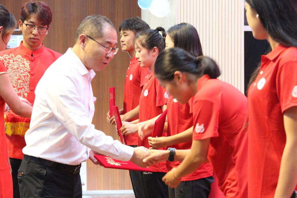 随后,党委书记缪军为获得大学生体质健康优秀等级证书的学生代表颁发证书。