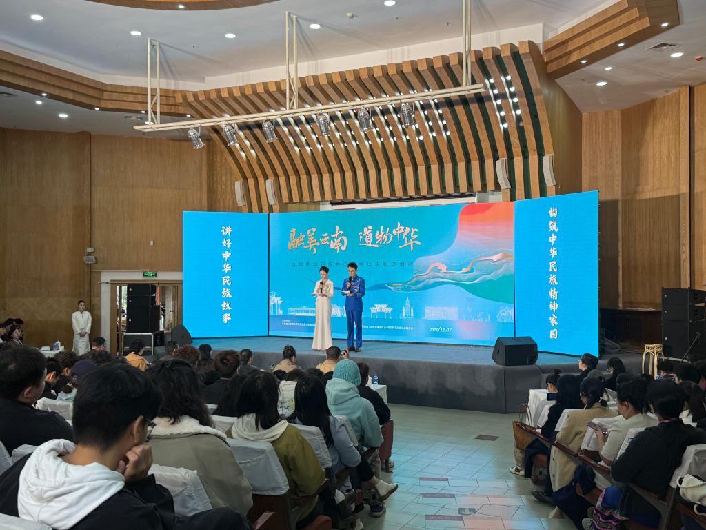 活动中,师生们观摩了“融美云南 道物中华”铸牢中华民族共同体意识讲解邀请赛决赛,并参观了“中国特色解决民族问题正确道路的云南实践”展览。在一面绣有汉、藏、彝、纳西等多民族文字的“我们永远跟着你走”锦旗前,师生们驻足凝视,聆听70多年来各族人民一心跟党走的动人故事。从技艺精湛的民族服饰、巧夺天工的手工艺品到承载生活气息的民俗用具,丰富的展品让大家直观感受到“多元聚为一体、一体容纳多元”的文明密码。