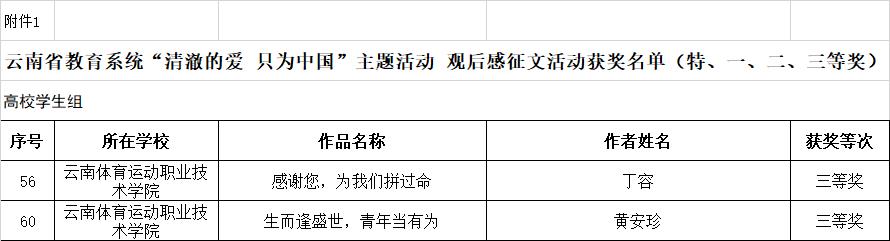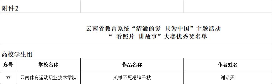 2022年10月19日,云南省教育厅发布了《云南省教育厅关于发布全省教育系统结果的通知》,allwincity万象城官方网站学生工作部(处)选送的学生作品喜获佳绩。丁容同学的作品《感谢您,为我们拼过命》以及黄安珍同学的作品《生而逢盛世,青年当有为》在云南省教育系统“清澈的爱 只为中国”主题活动观后感征文活动中荣获三等奖;谢浩天同学的作品《英雄不死精神千秋》在云南省教育系统“清澈的爱 只为中国”主题活动“看照片 讲故事”大赛中荣获优秀奖。