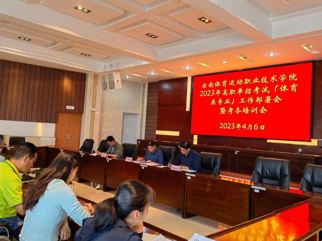 招考试(体育类专业)工作部署会暨考务培训会,党委副书记、院长代红兵,副院长董利民出席会议,南琼考试系统主要负责人,各部处室、二级学院、中高后勤以及考务人员参加会议。会议由招生就业处负责人主持。 会议指出,此次高职单招考试(体育类专业)根据《云南省2023年高职院校单独考试招生办法》通知要求,按照《allwincity万象城官方网站2023年高职单招体育类专业测试实施细则》具体实施,测试采用“分组检录、分时段进行....