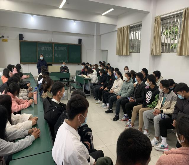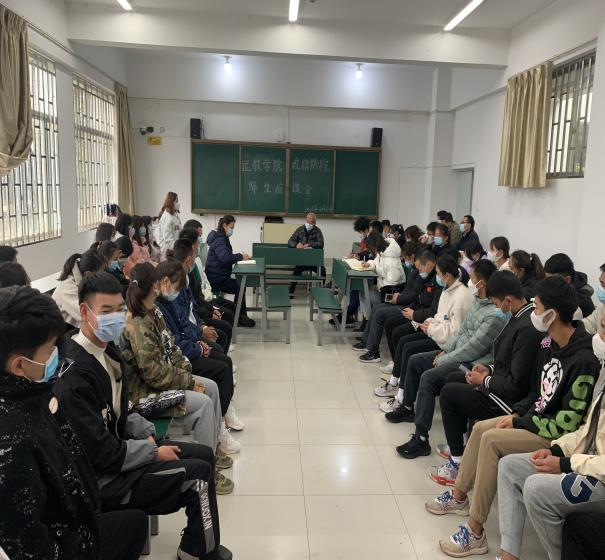 2022年4月2日下午16点,运动训练与教练员学院2022年春季学期疫情防控师生座谈会在学校云帆楼110教室召开。参会人员有运动训练与教练员学院党政领导班子、全体辅导员、学生会代表、各班学生代表共计50余人,会议由运动训练与教练员学院党总支书记尹西兰主持,分管运动训练与教练员学院校领导董从民出席本次座谈会。