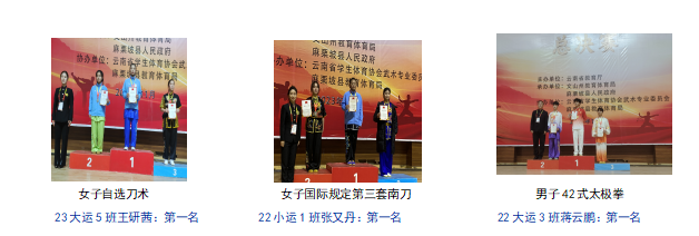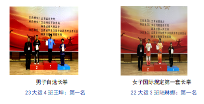 我院高丽琼和任典帅两名武术专任教师,选拔派出4男3女,共计7名同学,参加19个单项和1个集体项目的角逐。在比赛中,我院学生奋力拼搏、敢打敢拼,共斩获:金牌8枚,银牌4枚,铜牌1枚。获集体项目第一名,大学组团体总分第一名的可喜成绩。