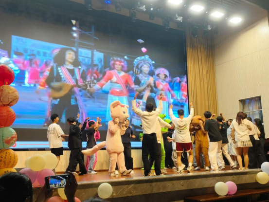 在茶话会的最后阶段,《悦动打跳》将气氛推向高潮,全场师生随着欢快的节奏共同舞动,礼堂化作一片欢乐的海洋。