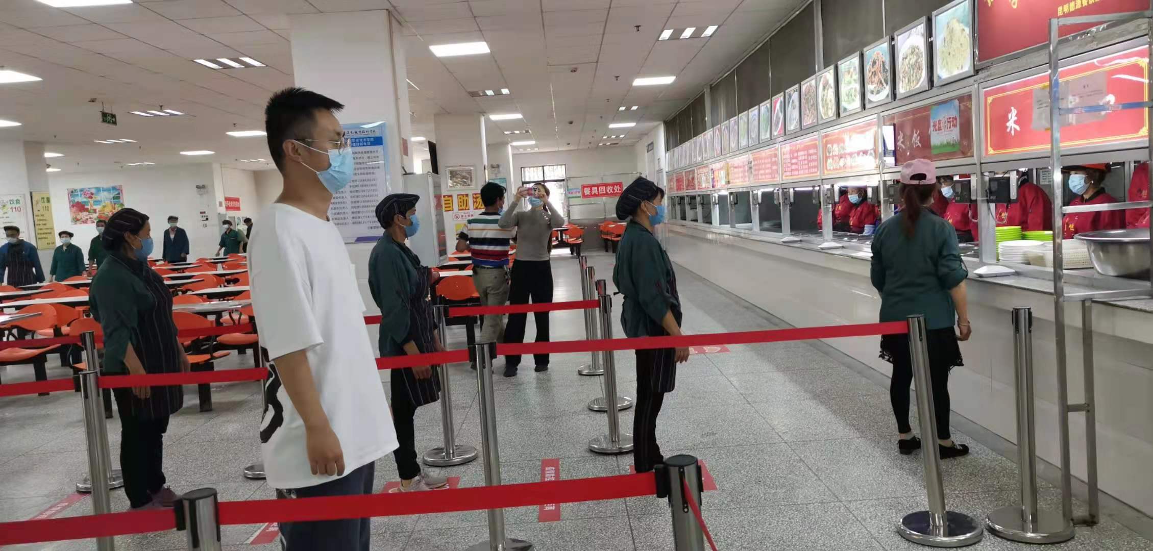 模拟学生在食堂一楼入口处排队等候,在引导员的引导下有序进入食堂。学生按指定路线依次到达指定窗口排队,排队间隔至少1米,现场有秩序维护人员维护秩序。选择任一套餐,志愿者进行选配。迅速离开食堂返回宿舍(若在食堂用餐,遵守食堂管理规定)。