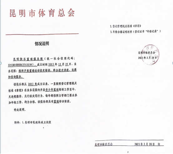 昆明快乐篮球俱乐部创建于2013年,至今是经昆明市体育总会、市民政局核准成立,具有独立法人资格的体育社团组织。