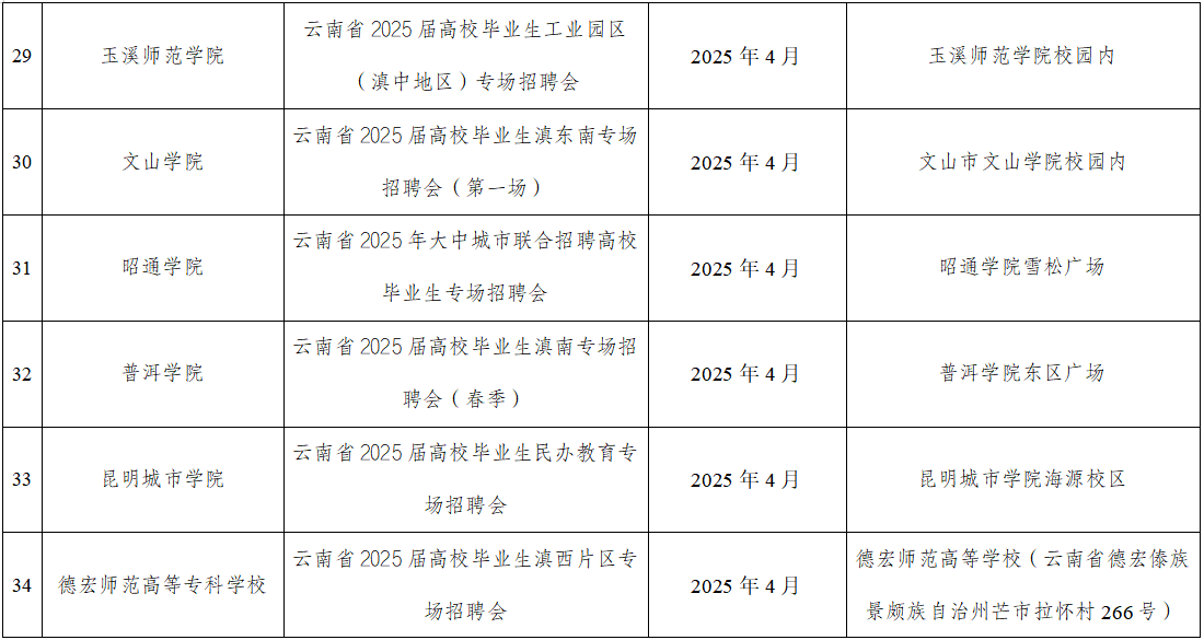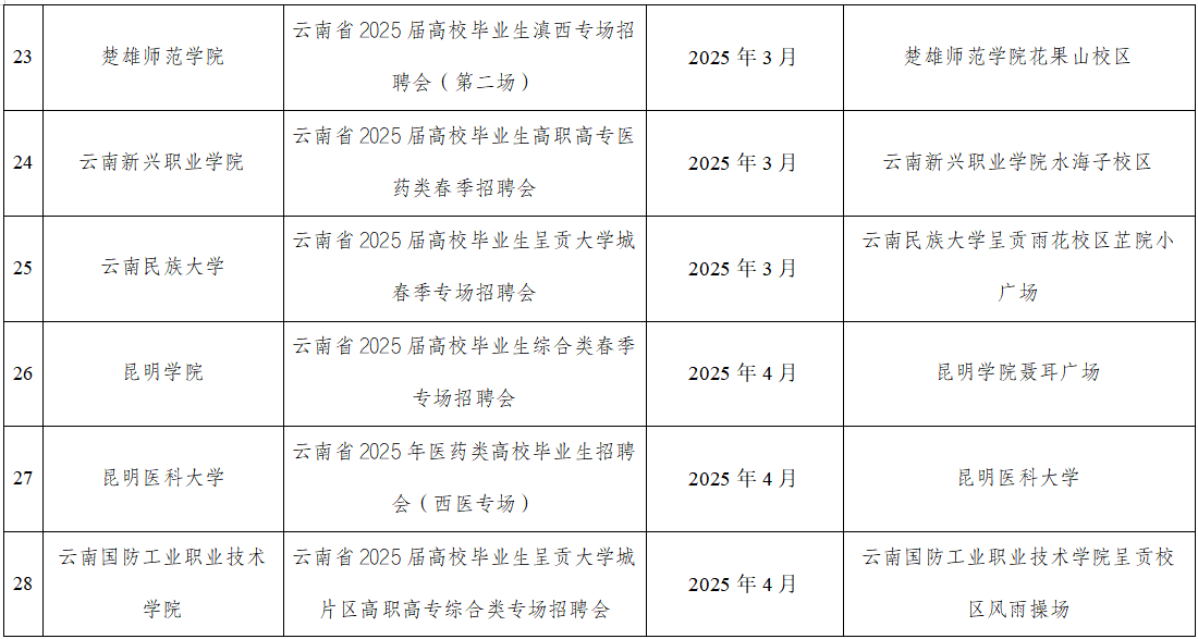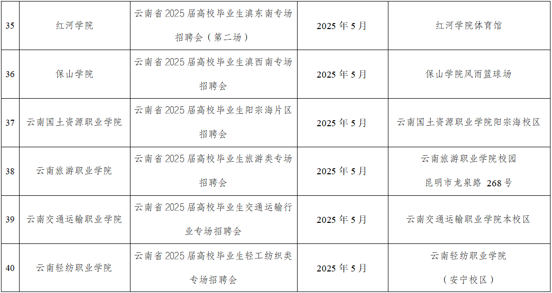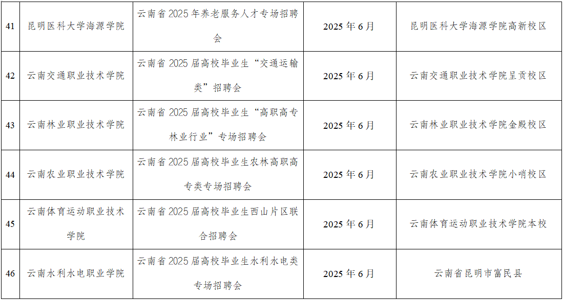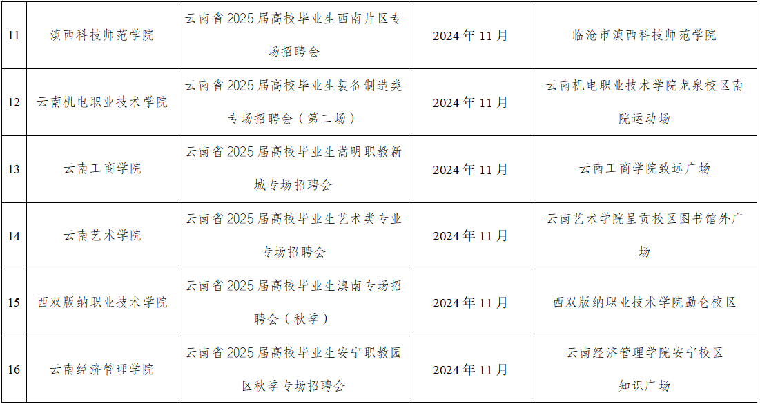 各场招聘会的具体举办时间、报名方式和参会要求都将在举办前至少2周,在云南高校毕业生智慧就业平台、承办高校就业信息网发布,有招聘需求的用人单位和毕业生可关注报名。